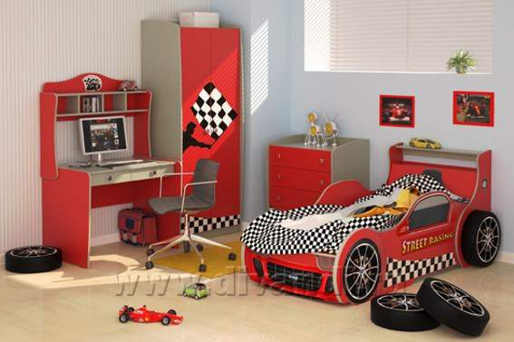 Комплект мебели «Пит-Стоп» состоящий из кровати, шкафа, компьютерного стола и комода приятно порадует юного гонщика.