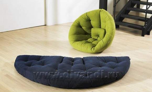 Кресло-футон задуман как гибрид между креслом и матрасом-кроватью для гостей, поэтому в мгновение ока комфортное сидение превращается в не менее комфортный матрас. Материалом обивки является износостойкий Шенилл. Палитра цветов насчитывает 37 вариантов цветового исполнения. Очень интересное и неординарное изобретение позволяющее решить сразу несколько функциональных вопросов.