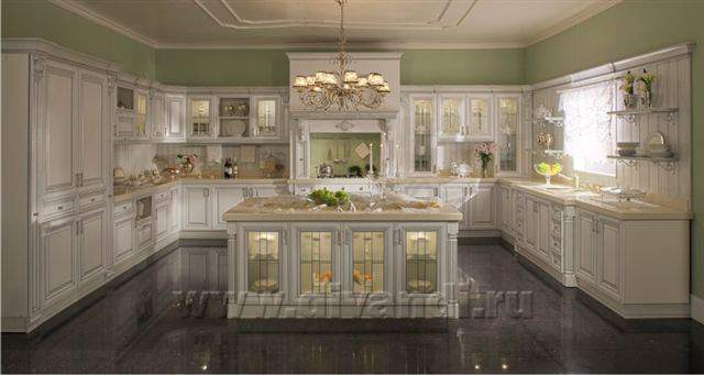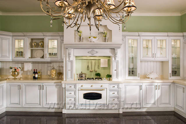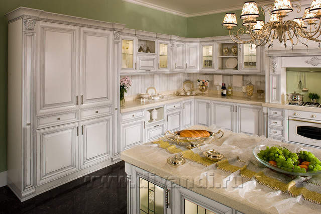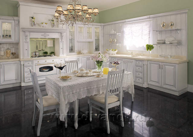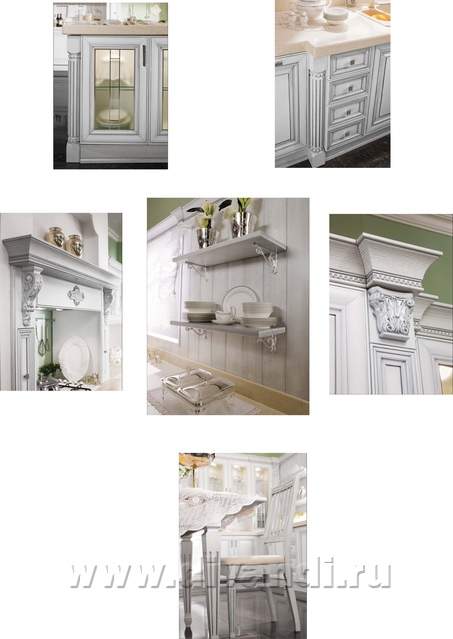 Для тех, кто ценит очарование и притяжение английской классики, кухня из массива черешни, окрашенного в белый цвет с серебряной патиной. Дополнена роскошными декорами и ручками со стразами Сваровски.