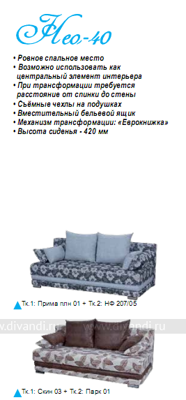 Нео-40 Диван с первого взгляда внушающий основательность и надежность. Эти качества получат высокую оценку у покупателей, благодаря ещё одному важному показателю дивана это – доступность. Надежный способ трансформации «еврокнижка», в совокупности с интересным дизайном мягких подушек наполненных крошкой ППУ, сделают диван вашим любимым местом в квартире. Мягкие элементы облицованы эластичным, листовым ППУ, и конечно имеется вместительный отсек для постельного белья.