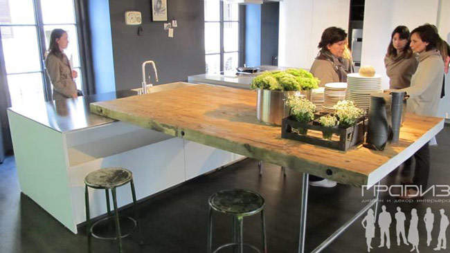 Исходя из того, что было представлено на выставке, главными материалами предстоящего сезона будут дерево, камень, кориан. Тренд – сочетание дерева с ярко выраженной текстурой и хромированной поверхности или любых современных материалов. Например, Boffi предлагает большой выбор кухонь с деревом и металлом. В каждом стенде присутствовала зелень, она очень освежает любой интерьер, поэтому все озеленяемся!