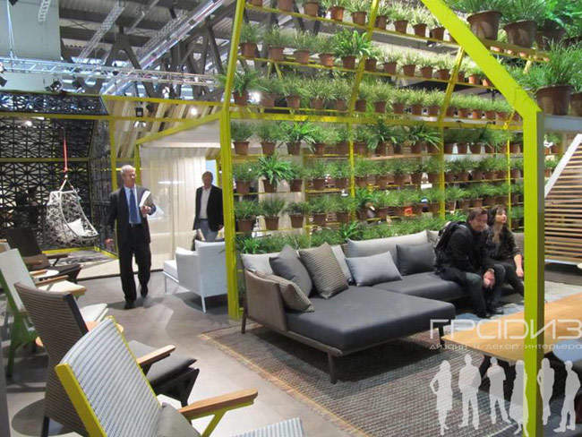В первую очередь, это отразилось на стендах компаний. Так, например, Moroso (итальянская мебельная компания) оформили свою экспозицию, используя деревянные необработанные балки и строительную арматуру. На многих стендах пол, стены и даже витрины были выполнены из древесно-стружечных плит, выкрашенных в белый цвет. Кто-то декорировал стены пластиковыми бутылками с растениями. Смотрелось оригинально. Так же были стенды, собранные из металлических строительных элементов – выглядит индустриально и стильно.