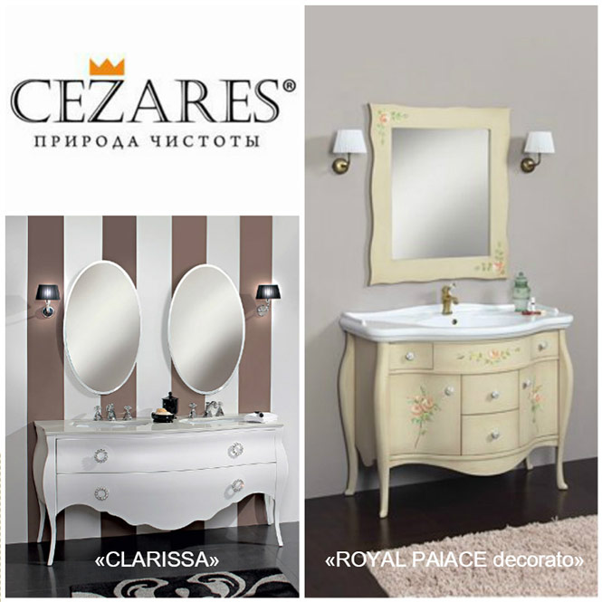 Фирменный салон CEZARES представил несколько предметов для обстановки ванной комнаты от итальянских дизайнеров. В новой коллекции база под две раковины с двумя выдвижными ящиками 175x65x80 из серии CLARISSA и База под раковину с двумя распашными дверцами и четырьмя выдвижными ящиками 110x60x80 из серии ROYAL PAlACE decorato. Эти предметы мебели могут быть выполнены в разных цветовых решениях. База CLARISSA имеет столешницу из керамогранита. У базы ROYAL PAlACE decorato столешница мраморная.