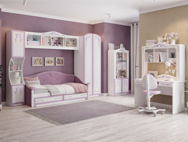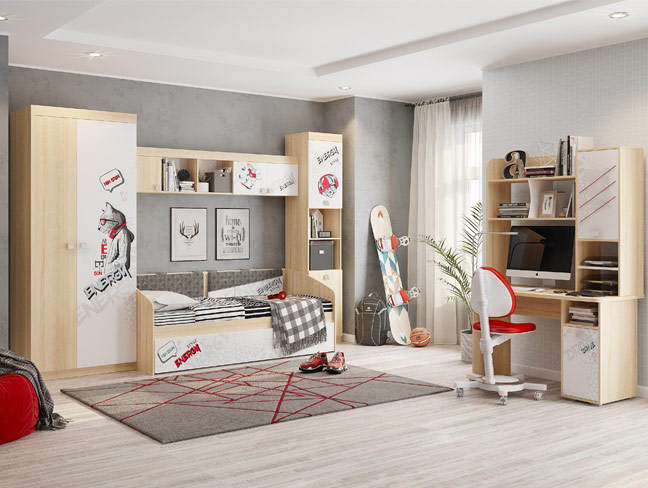 Линейка «Энерджи» включает в себя 10 модулей. Это, в том числе, шкафы для одежды, шкафы-купе, комод, письменные столы, полки, и кровать-софа выдвижная.