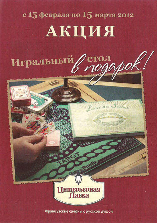 Салон «Интерьерная лавка» с 15 февраля по 15 марта проводит акцию – при покупке на сумму свыше 350 000 рублей покупатели получают в подарок игральный столик (материал: массив акации; произведено: Comptoir de Famille, Франция; стоимость: 43 621 руб.). Количество подарков ограничено.
