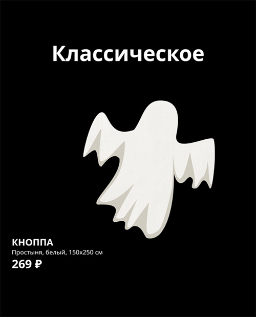 Российское отделение IKEA присоединилось к празднованию Хеллоуина и выпустило рекламу постельного белья, вдохновленную образом привидения. В ней можно найти отсылки и к Карлсону, который использовал простыню, чтобы выдать себя за призрака и отпугнуть преступников.