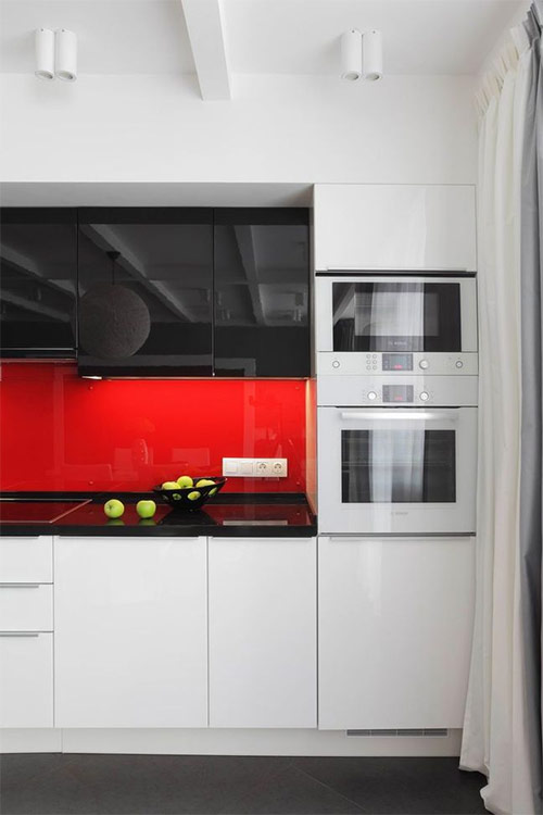 В интерьере много цветовых акцентов. На кухне-гостиной — ярко-выраженный красный, в спальне — насыщенный малиновый. Кабинет смотрится строго, при этом динамично. Особого внимания здесь заслуживает графика на стенах: на одной из них обои, другая — расписана дизайнером студии «Градиз».