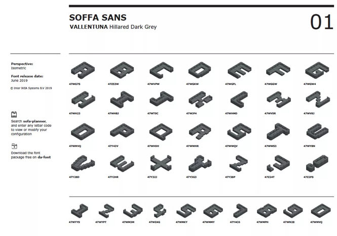Используя программу, они стали создавать самые невообразимые комбинации – фантастические конструкции, лабиринты или слова. Компания это начинание поддержала и представила диванный шрифт, который получил название Soffa Sans. Все буквы в нем сделаны из элементов тех самых диванов Vallentuna. Его можно скачать на сайте компании.