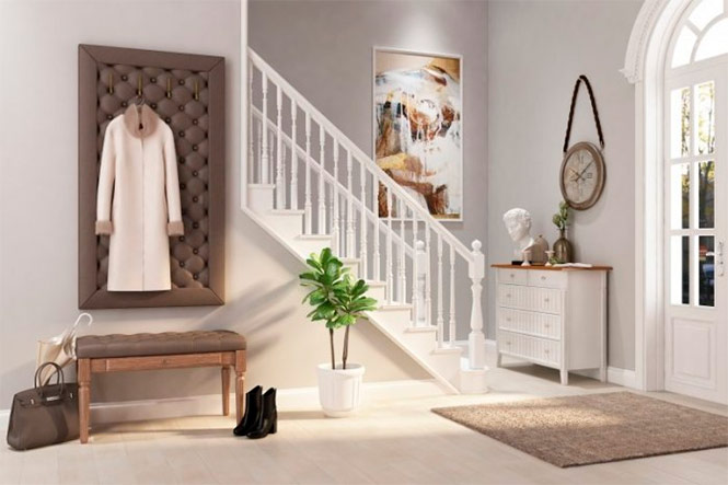 Имеется банкетка с мягким сидением. Здесь же можно разместить сумки и аксессуары, оформить мини-зону для хранения обуви.