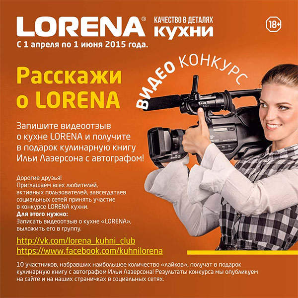 Для участия в конкурсе необходимо записать видеоотзыв о кухне LORENA и разместить его на страничке компании ВКонтакте или Фейсбук. Десять конкурсантов, набравших наибольшее количество «лайков», получат в подарок кулинарную книгу Ильи Лазерсона с автографом автора.