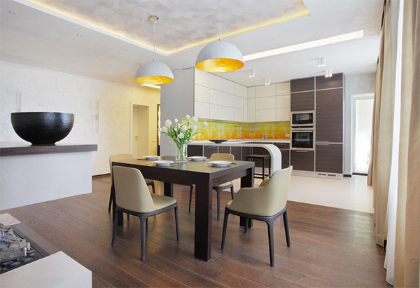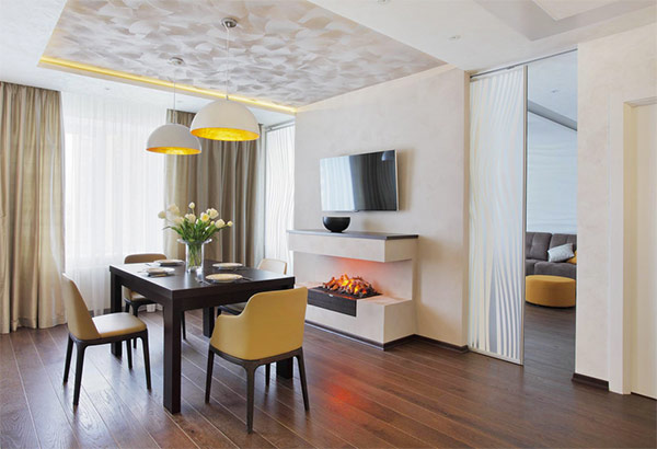Проект квартиры в Екатеринбурге для четырех человек назвали «Теплый прием». В квартире есть просторная кухня-столовая. Центром обеденной зоны стал камин Dimplex, встроенный в нишу так, чтобы он хорошо просматривался со всех сторон.