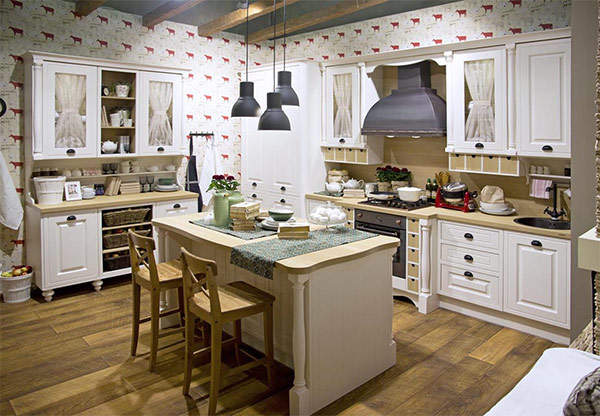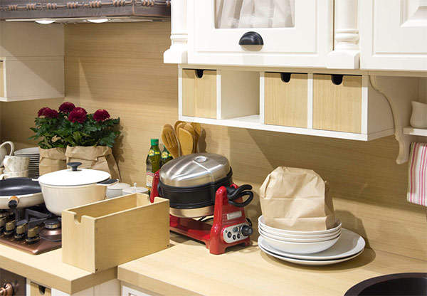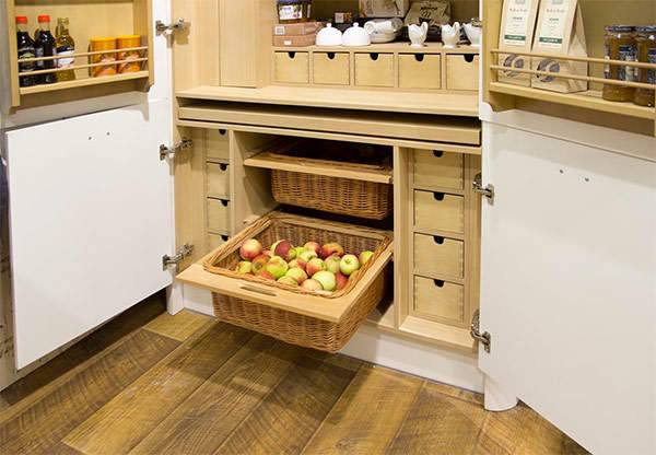 Модель Village – тёплая летняя нотка коллекции LORENA. Ансамбль близок к английской классике. В целом сдержанный и лаконичный, он полон нюансов: колонны и полуколонны, опоры для буфета, ящики для специй, плетёные корзины. «Визитная карточка» модели – тёплая древесина внутри: она превращает кухню в затейливую «шкатулку» – особенно интересным получился буфет. Он незаменим для хозяйки: здесь есть и выдвижная система хранения, и не менее удобные выдвижные корзины, и держатели для бокалов, ящики и ящички разного габарита (для столовых приборов, специй), и даже на дверце – полка для бутылочек с маслом и соусами.