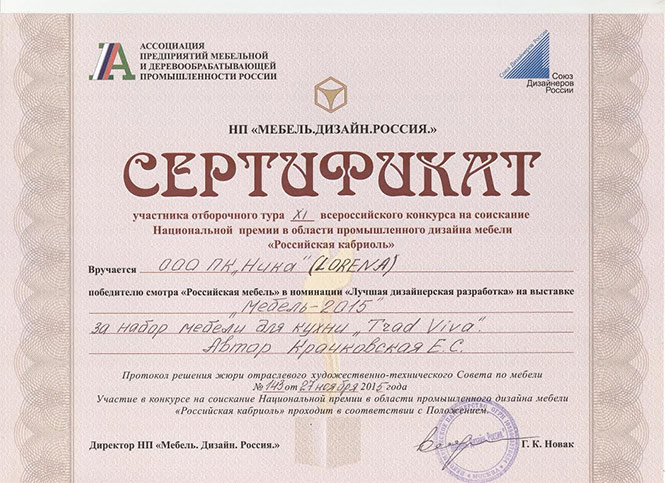 По решению жюри отраслевого художественно-технического Совета по мебели комбинация «Trad & Viva» стала победителем смотра «Российская мебель» в номинации «Лучшая дизайнерская разработка».