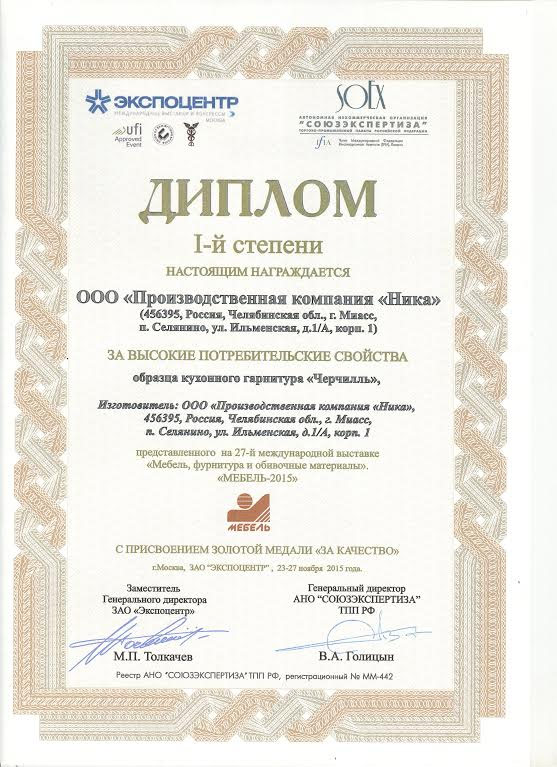 Качество мебели оценивали независимые эксперты компании АНО «СОЮЗЭКСПЕРТИЗА» ТПП РФ и по результатам их оценки компания «LORENA-кухни» получила диплом 1 степени «За высокие потребительские свойства» с присвоением Золотой медали «ЗА КАЧЕСТВО».