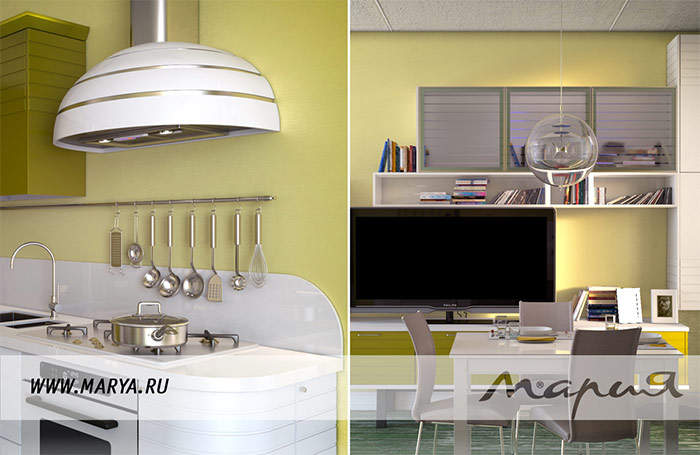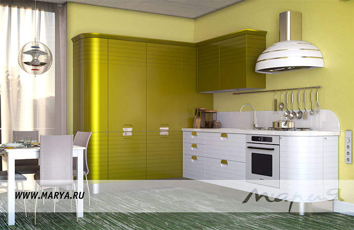 Life – совместная разработка Мебельной фабрики «Мария» и итальянского дизайнера Massimo Brollini (компания Fabbri Group Italia). Авторские идеи воплощены в каждой детали кухни–модельных хромированных ручках, оригинальных скругленных карнизах, неординарных фигурных фасадах.