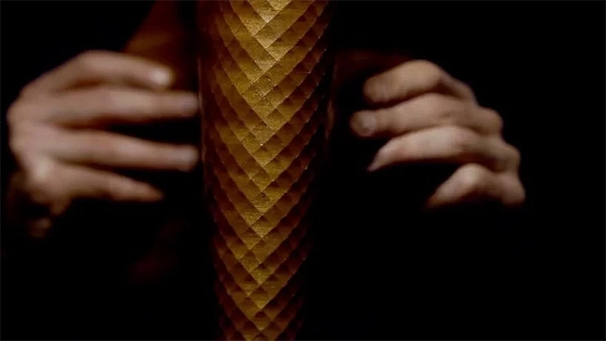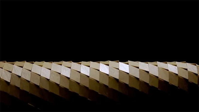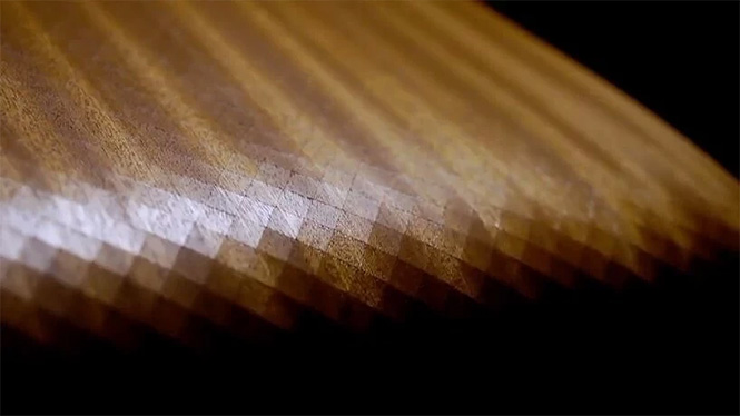Для разработки гибкого дерева потребовалось более 10 лет исследований. Создатели вдохновлялись геометрическими элементами и натуральным орнаментом дерева, поэтому у них получился материал с диагонально перекрестной штриховкой. Именно она позволяет твердой древесине изгибаться в разные стороны.