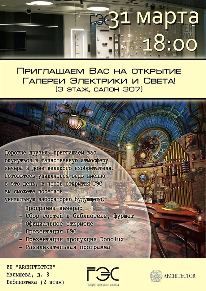 Церемония открытия новой Галереи Электрики и Света (ГЭС) пройдёт 31 марта 2016 года в библиотеке ИЦ ARCHITECTOR. Начало сбора гостей в 18.00. в ходе презентации салона будет проведён краткий обзор предложений в сфере светодиодных систем освещения и электротехники от европейских производителей.