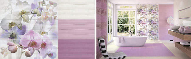Испанская плитка PARIS (25х75) фабрики Azulejos Mallol (Absolut Keramika SL) цвета слоновой кости, мальвы и сирени по своей текстуре напоминает ткань. Украшением коллекции PARIS являются декоративное панно (75х75) и бордюры (7,5х75) с фотографическим изображением нежнейших орхидей. Они наполняют пространство атмосферой весны, вносят особое очарование и оригинальность. Глянцевая настенная плитка PARIS продается в комплекте с напольным керамогранитом размера 33,3х33,3, сочного лилового оттенка.