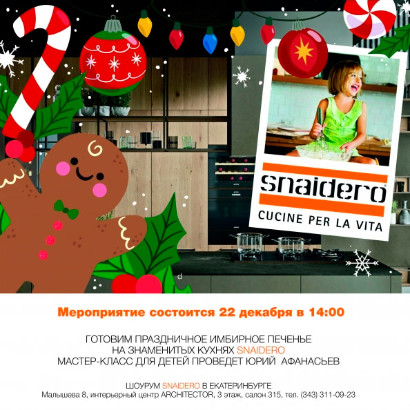 22 декабря 2018 года в шоуруме современной кухонной мебели Snaidero состоится новогодний мастер-класс, на котором дети приготовят и украсят имбирное печенье под руководством учителя изобразительного искусства и черчения Юрия Афанасьева.