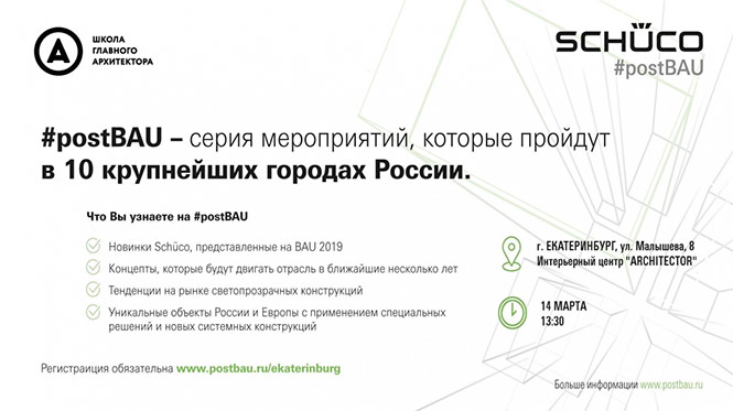 Мероприятие рассчитано на профильных специалистов. Участие в семинарах бесплатное. Регистрация открыта на сайте http://postbau.ru. Место встречи: ИЦ ARCHITECTOR, 3 этаж, помещение 314, SCA-LAB.