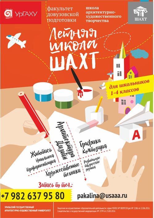 Для учащихся 1-4 классов Школа архитектурно-художественного творчества (ШАХТ) реализует дополнительную образовательную программу «Изобразительное искусство: художественное моделирование». Предметы: графика, живопись, моделирование. Полный курс — 4 недели. Занятия ежедневно, кроме субботы и воскресения с 9.00 до 12.00. Проведение занятий в июле, по мере набора групп.
