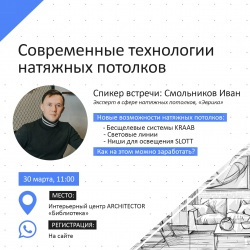 30 марта 2020 года ООО «Эврика – натяжные потолки» проведёт семинар «Современные технологии натяжных потолков». Встреча пройдёт в библиотеке ИЦ ARCHITECTOR с 11.00 до 13.00. Вход свободный. Предварительная регистрация по тел. +7 (922) 214-74-44.