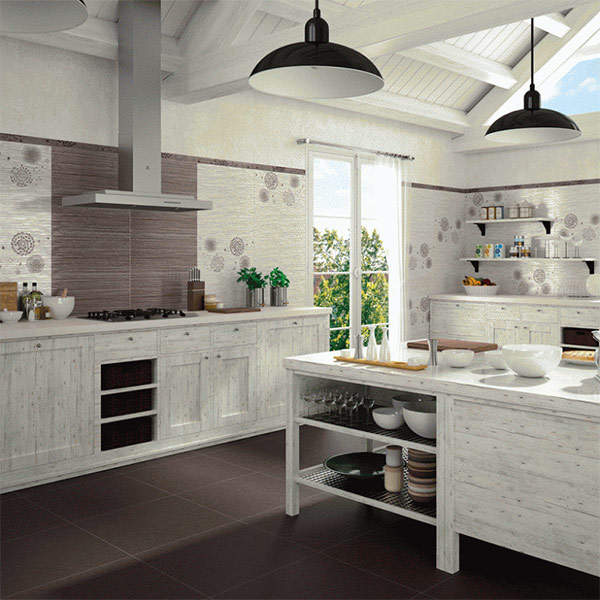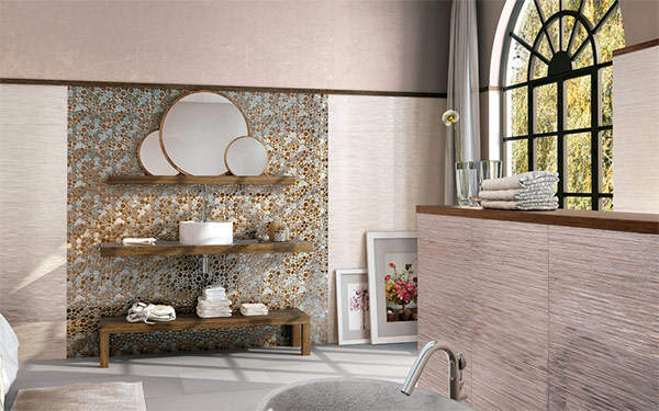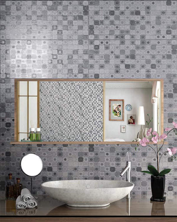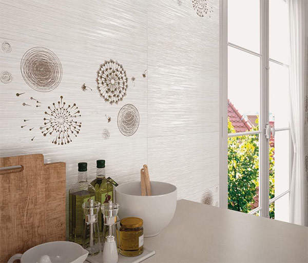 Основная плитка имеет текстурную поверхность, изрытую бороздками. Для оформления использованы геометрические и природные мотивы.