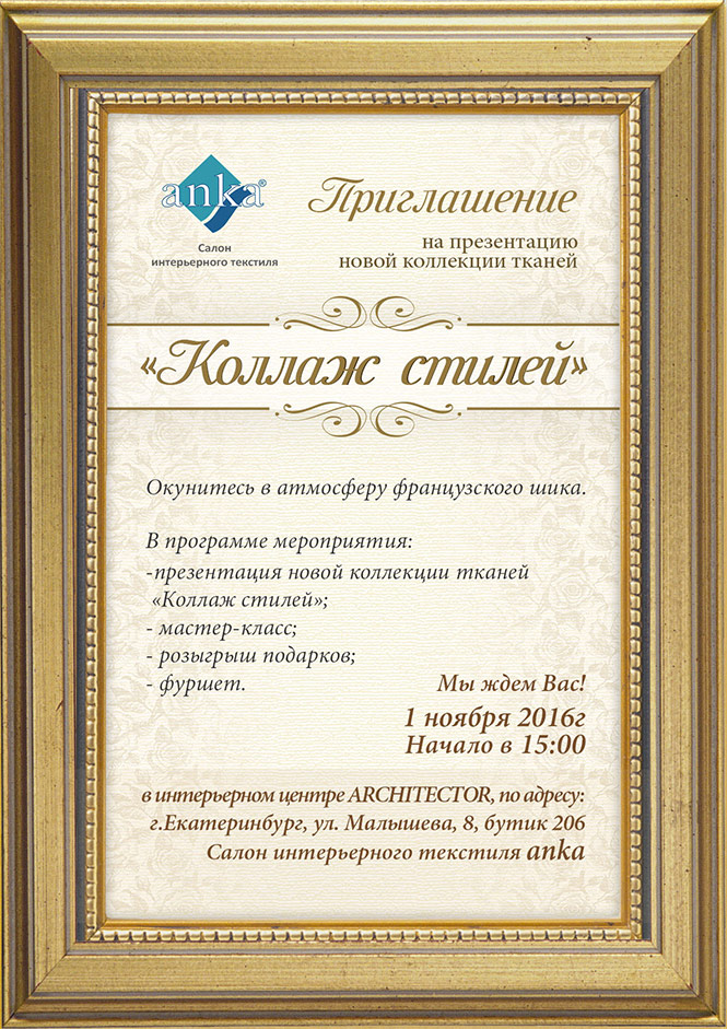 Салон интерьерного текстиля ANKA 1 ноября 2016 года приглашает на презентацию новой коллекции тканей.