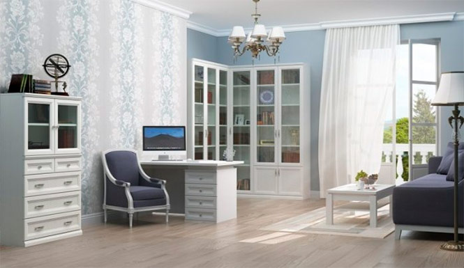 Рабочая зона формируется из минимума предметов. При этом в базовом наборе предусмотрен максимум функций. Основу комплекта составляют стол, комод и шкафы-витрины.