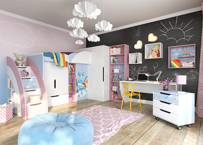 Еще одна детская представляет собой яркое пространство с героями из мультсериала My Little Pony от Hasbro. Корпус и фасадные элементы выполнены в декорах «Белый премиум», «Селеста» и «Фламинго». Столешница рабочего стола выполнена из МДФ в декоративной пленке «Сета Эдельвейс».