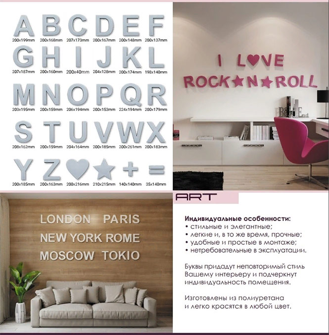 Декоративные буквы это новое и яркое слово в дизайне. Легкие, стильные, элегантные, прочные, удобные в монтаже и нетребовательные в эксплуатации, они придадут неповторимый стиль интерьеру.