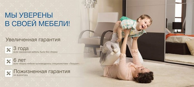 Стандартный срок гарантии на мебель «Лазурит» увеличен до 36 месяцев. При сборке мебели службой сервиса «Лазурит» гарантия увеличивается ещё на 36 месяцев (кроме серий «Джаксони» и «Прага»). Кроме того торговый дом вводит норму о возможности возврата покупателем уже собренной мебели в течение 30 календарных дней с момента сборки службой сервиса «Лазурит».