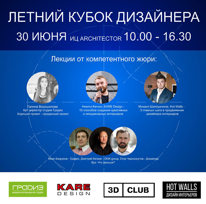 30 июня в ИЦ ARCHITECTOR пройдет главная битва молодых и амбициозных дизайнеров «Летний кубок дизайнера». Гостей ждут лекции от профессионалов: «Хороший проект - проданный проект», «Вуз. Что дальше?», «10 способов создания креативных и неординарных интерьеров», «3 главных шага в продвижении дизайнера интерьеров"