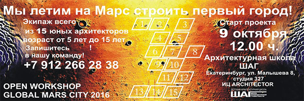 Детская Архитектурная Студия ШАГ и ИЦ ARCHITECTOR 9 октября 2016 года проводят первый workshop (мастерскую) «GLOBAL MARS CITY 2016» под девизом: Мы летим на Марс строить первый город.