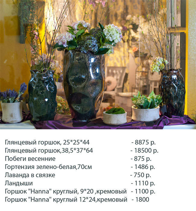 - Ассортиментом изделий из керамики (вазоны, интерьерные и цветочные горшки, подсвечники) и из стекла ручной работы;