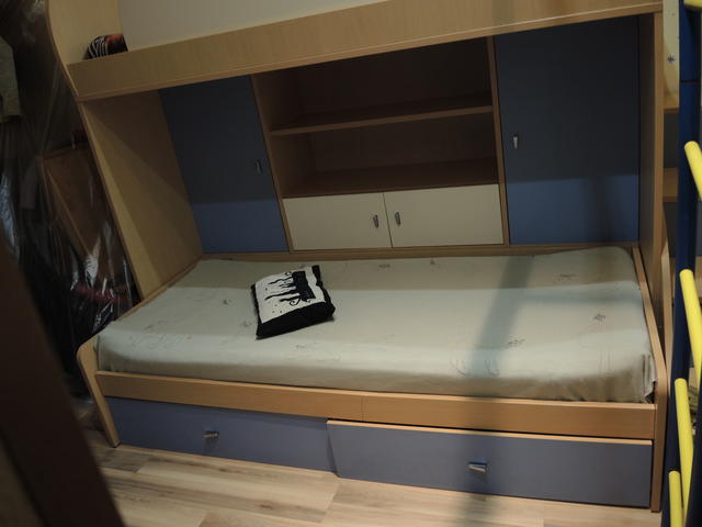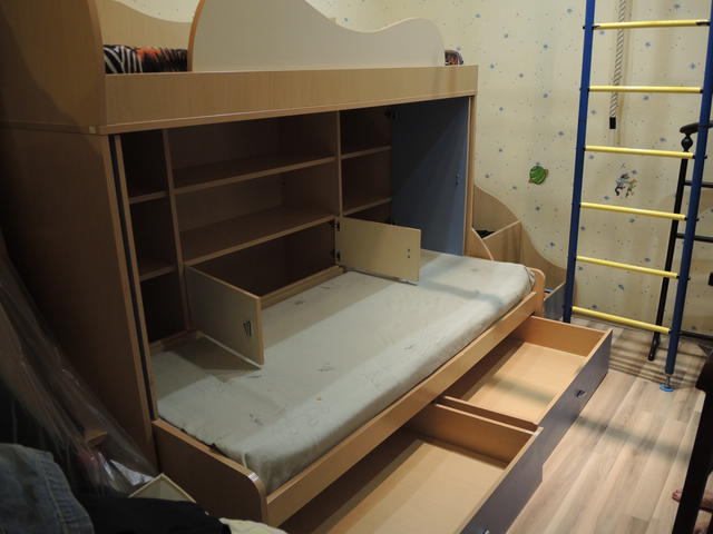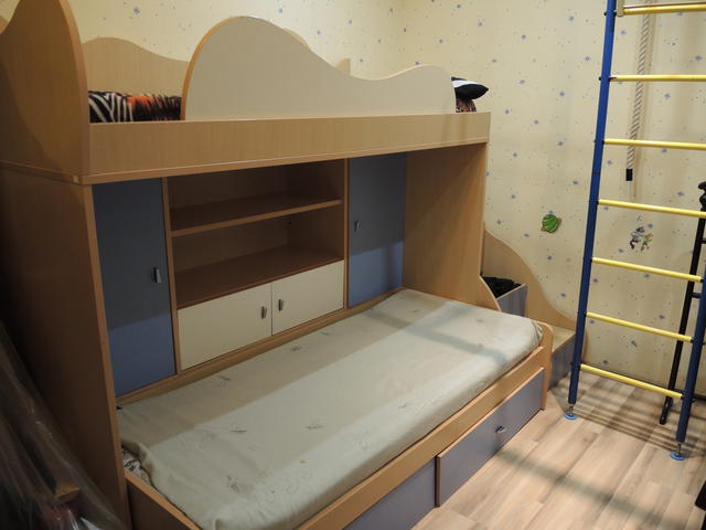 Продаю двухъярусную кровать, размер спальных мест 80х190, высота корпуса кровати 170 см, ширина 132см, очень вместительные ящики строены в корпус кровати и в ступени лестницы. Нижняя кровать может стоять отдельно.