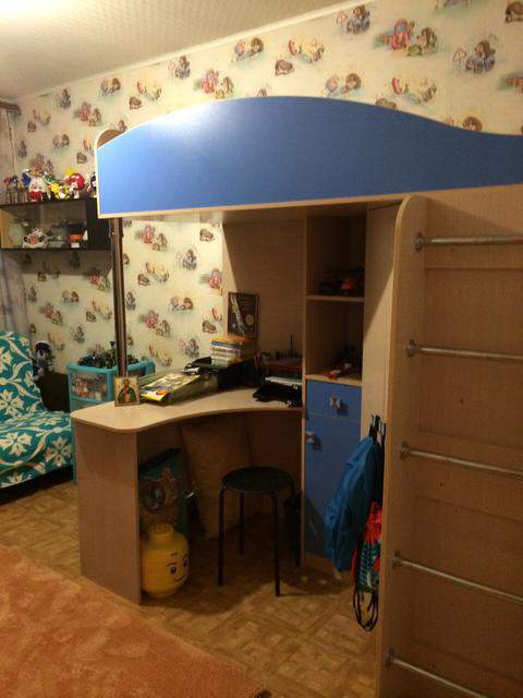 Продажа новой детской многофункциональной двухярусной кровати, состоящей из кровати с лестницей, шкафа для одежды, большое количество полочек и шкафчиков, стол для занятий. Покупалась в магазине Гулливер Kids. на фото в голубом цвете. Кровать уже разобрана и ждет своего обладателя.