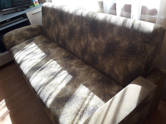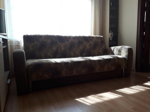 Диван-кровать, механизм - еврокнижка, габариты 900*900*2200, спальное место 1600*2000, состояние - хорошее, оббивка без повреждений, не скрипит.