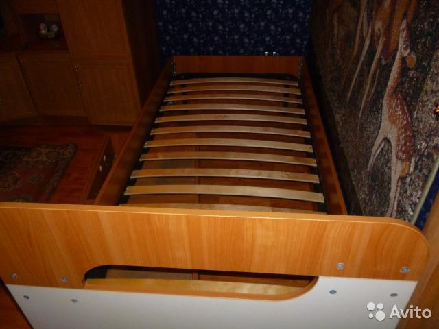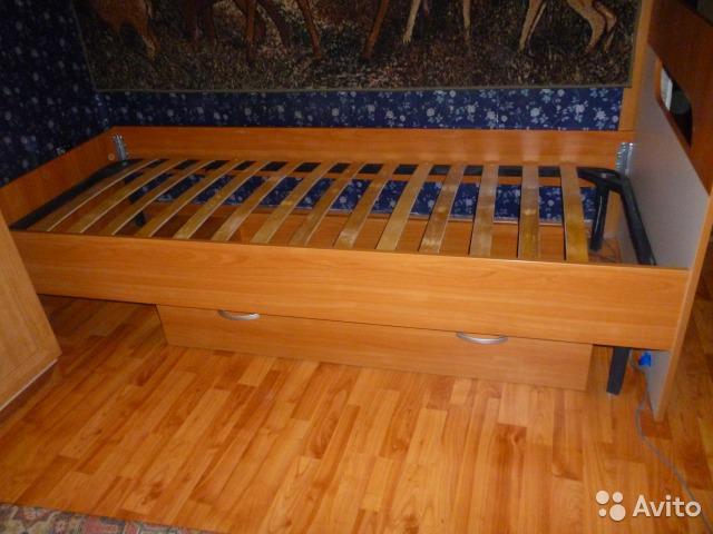 К кровати в комплект идет выдвижной ящик, и одна запасная ножка. ш-90, д~2м При необходимости дополнительно отдадим матрас за доп. плату.