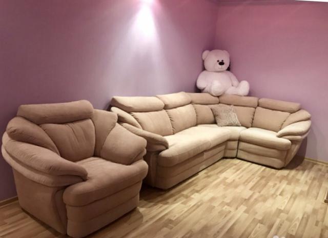 Мягкий угловой раскладной диван с креслом прекрасно подойдет в зал.