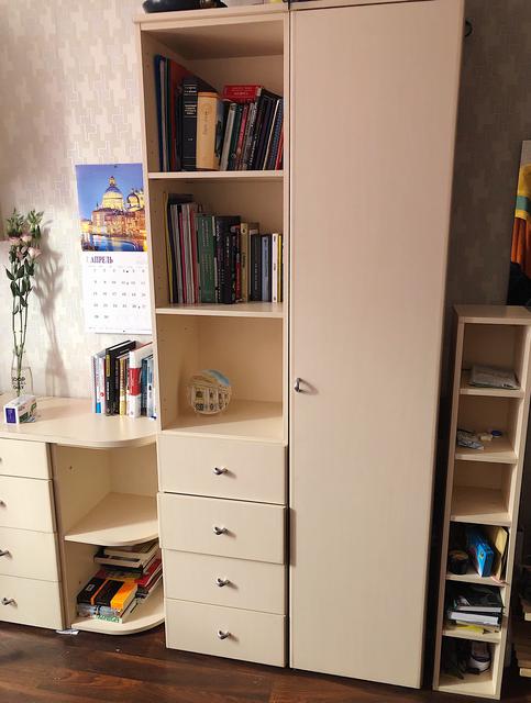 Качественная стенка от производителя Дядьково. В набор входит - компьютерный угловой стол, тумба, навесной стеллаж, два шкафа пенала, стеллаж под диски.