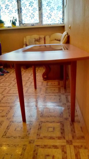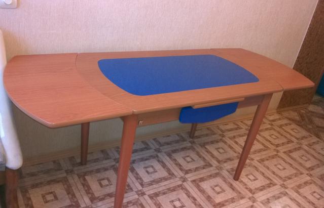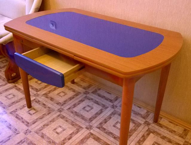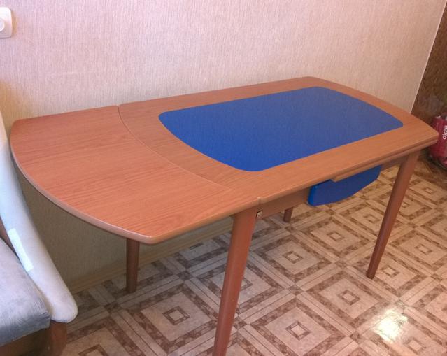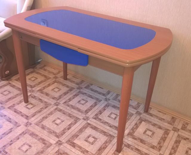 Продаю раздвижной обеденный деревянный стол, в столешнице вставка из закалённого стекла синего цвета. Из-под столешницы выдвигается стильный ящик.