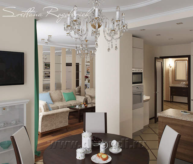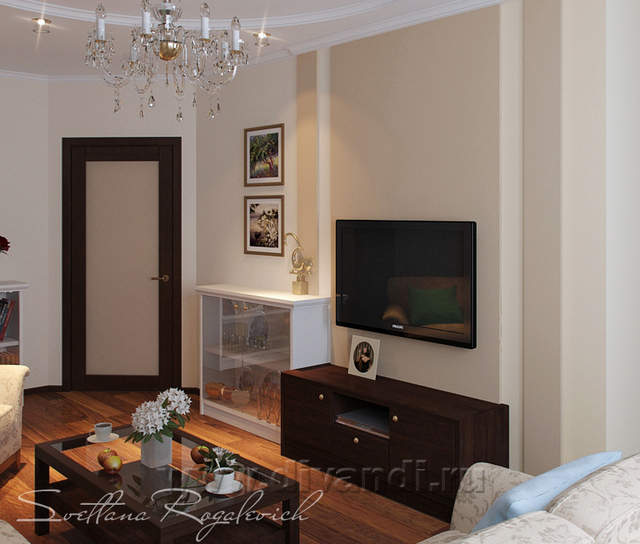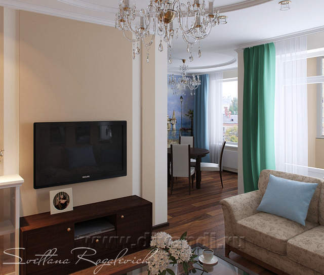 Будучи хозяевами огромного дома на севере тюменской области, заказчики очень хотели в своей новой квартире визуально увеличить пространство гостиной, чтобы хоть это помещение казалось просторней.