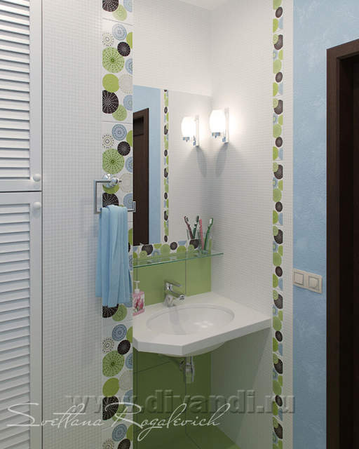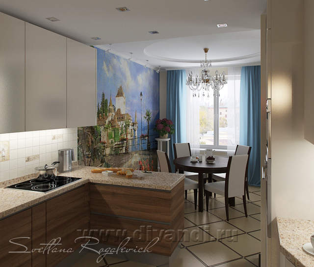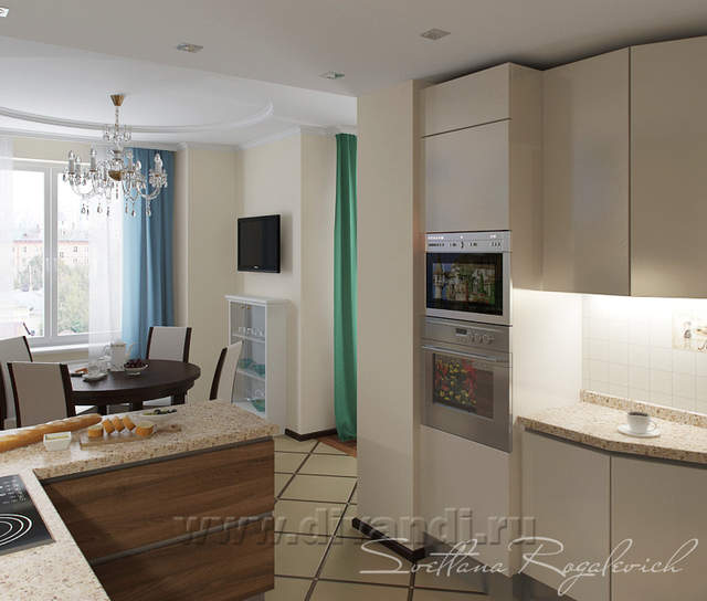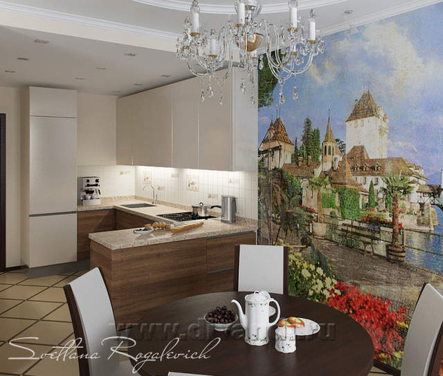 Исходя из этого пожелания, было предложено снести часть перегородки между кухней и гостиной, что объединило пространство комнаты с уютной столовой зоной. Фреска с пейзажем приморского южного города визуально добавляет простора.