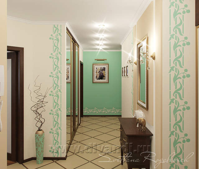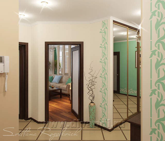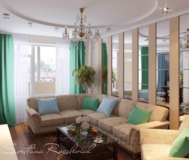 Использование зеркальных вставок за диваном также не случайно - при входе в гостиную очень эффектно смотрится отражение столовой зоны на фоне красивого пейзажа.