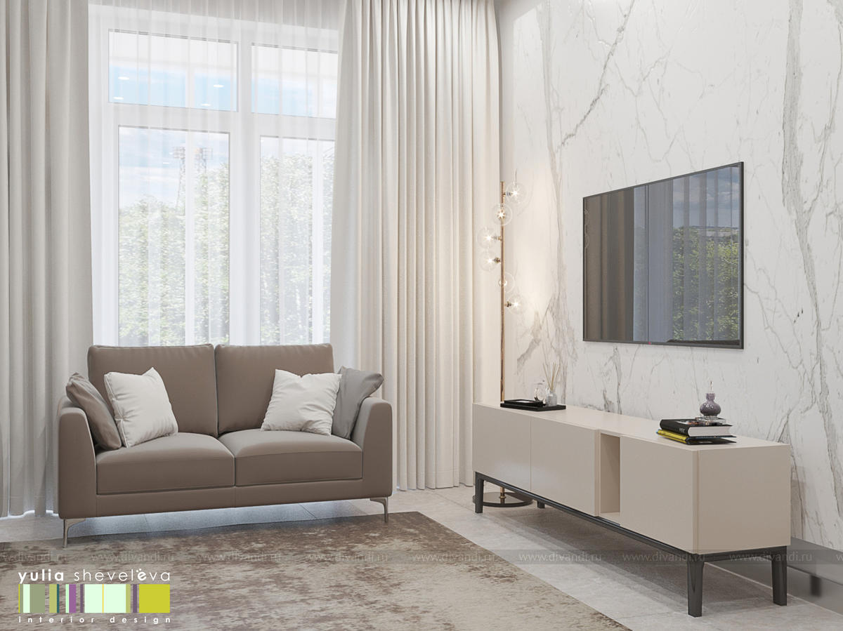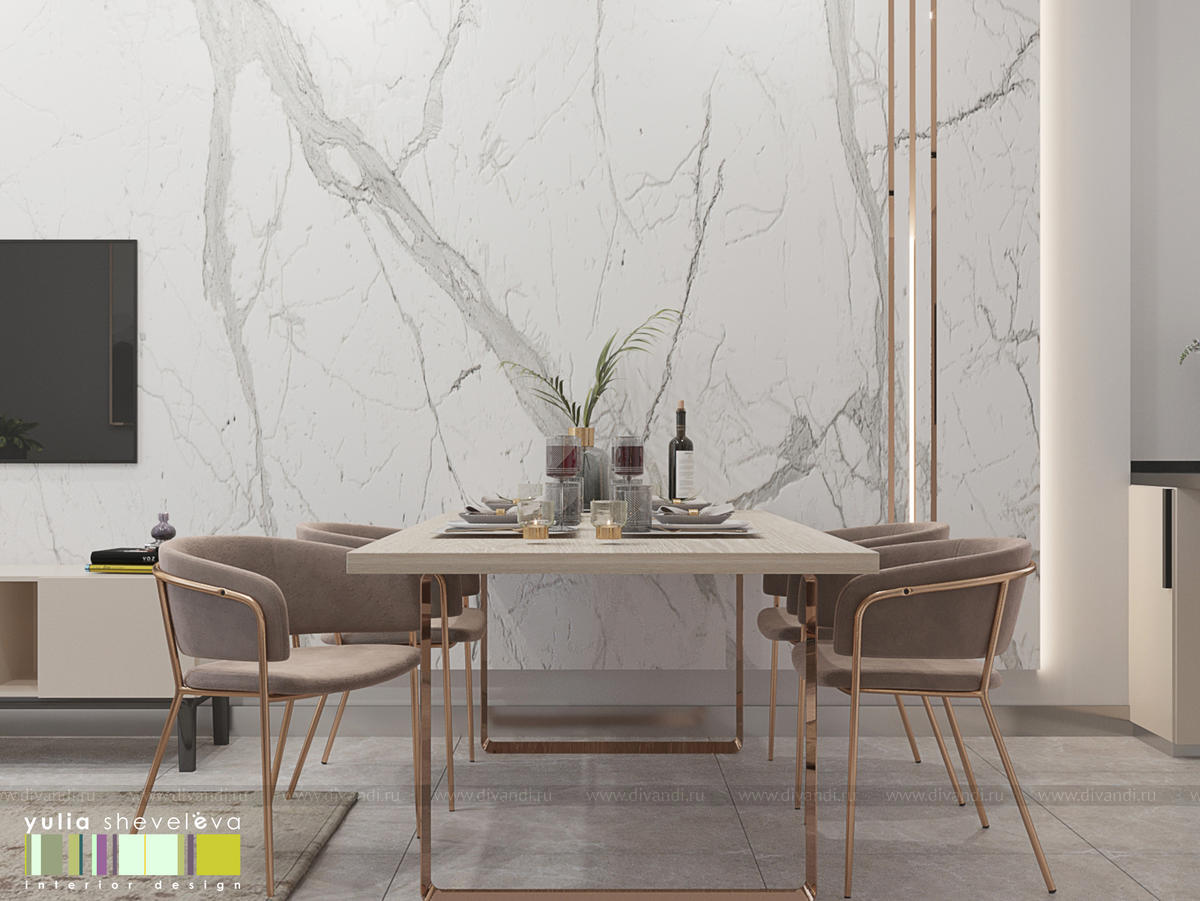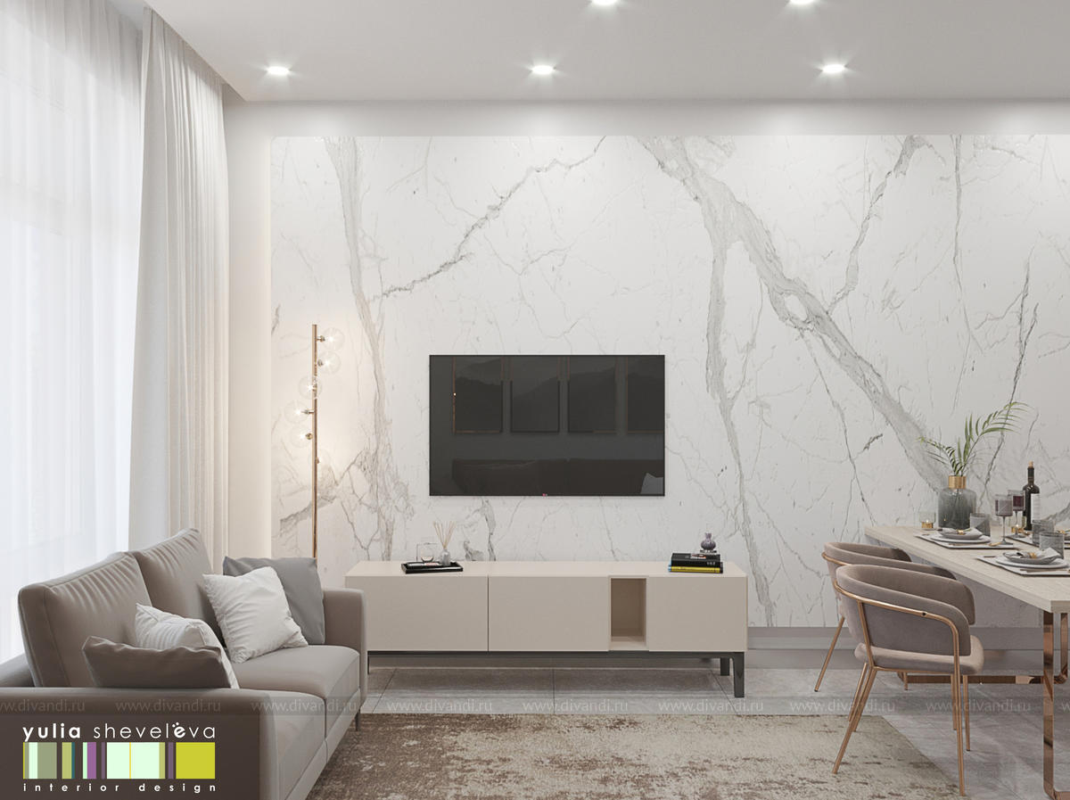 Интерьер выполнен в светлых нейтральных тонах с легкими акцентами. В проекте взаимодействуют и переплетаются мрамор, дерево и латунь. А нежный текстиль придает интерьеру тепло и уют.