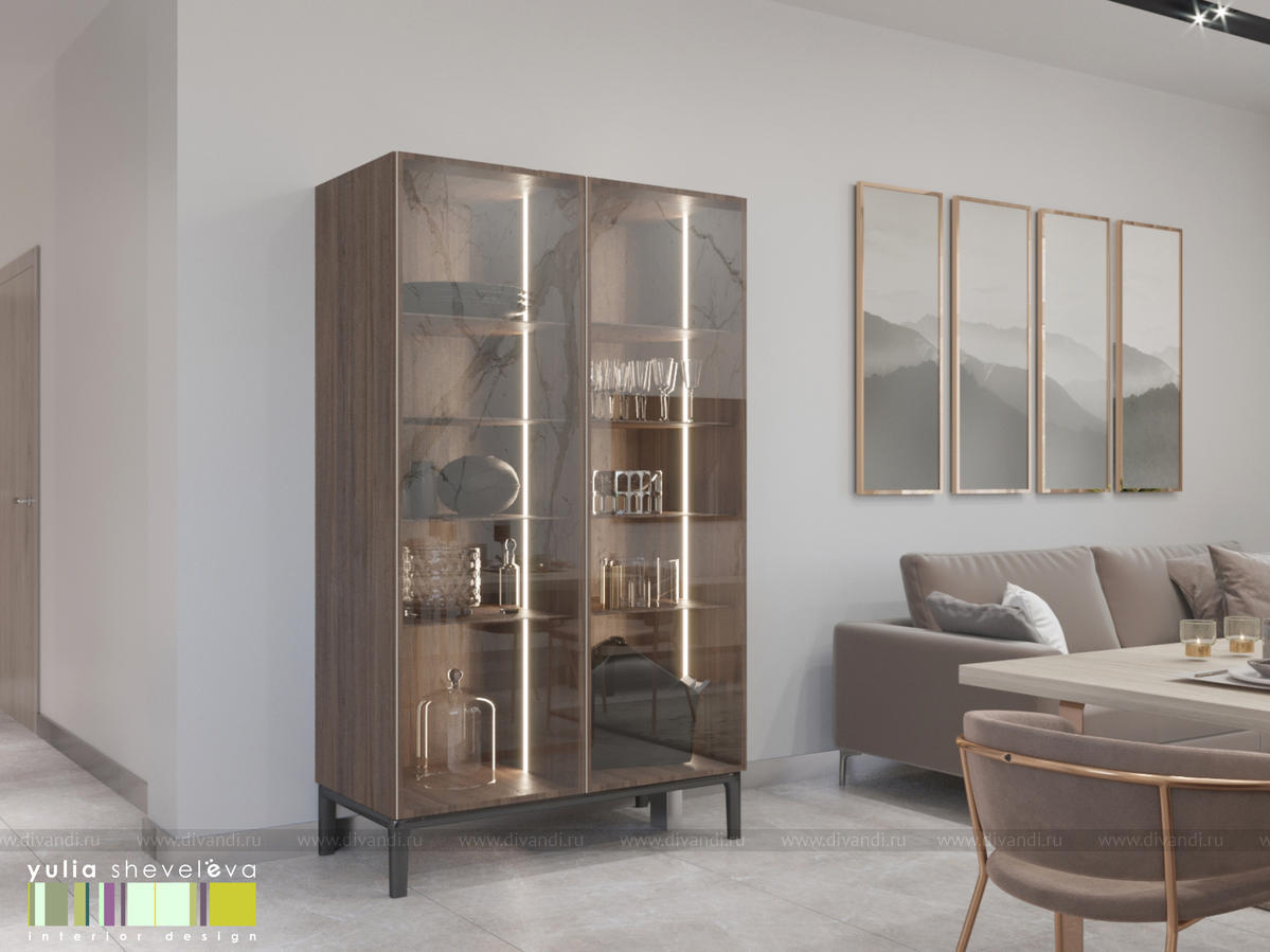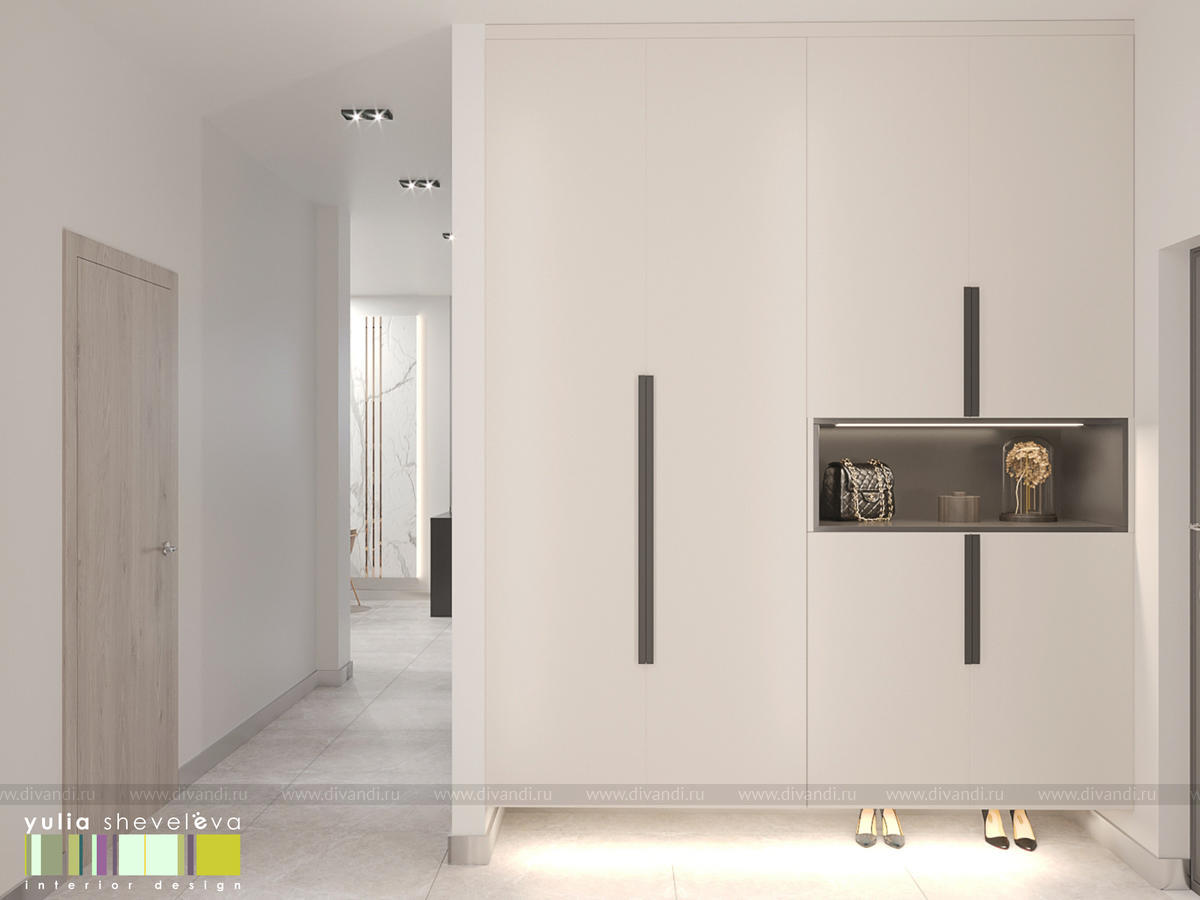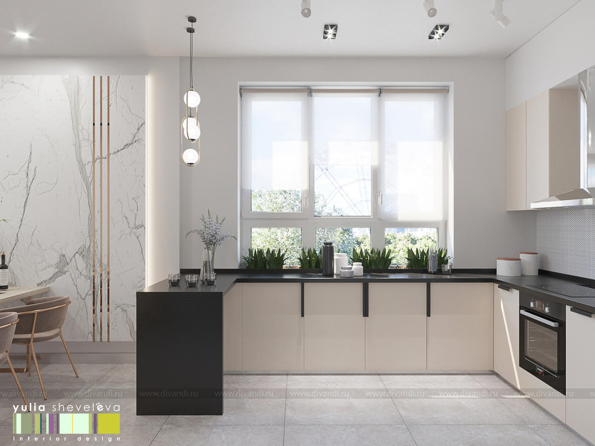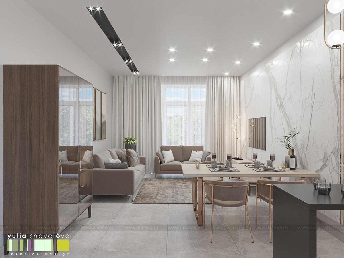 Интерьер выполнен в светлых нейтральных тонах с легкими акцентами. В проекте взаимодействуют и переплетаются мрамор, дерево и латунь. А нежный текстиль придает интерьеру тепло и уют.