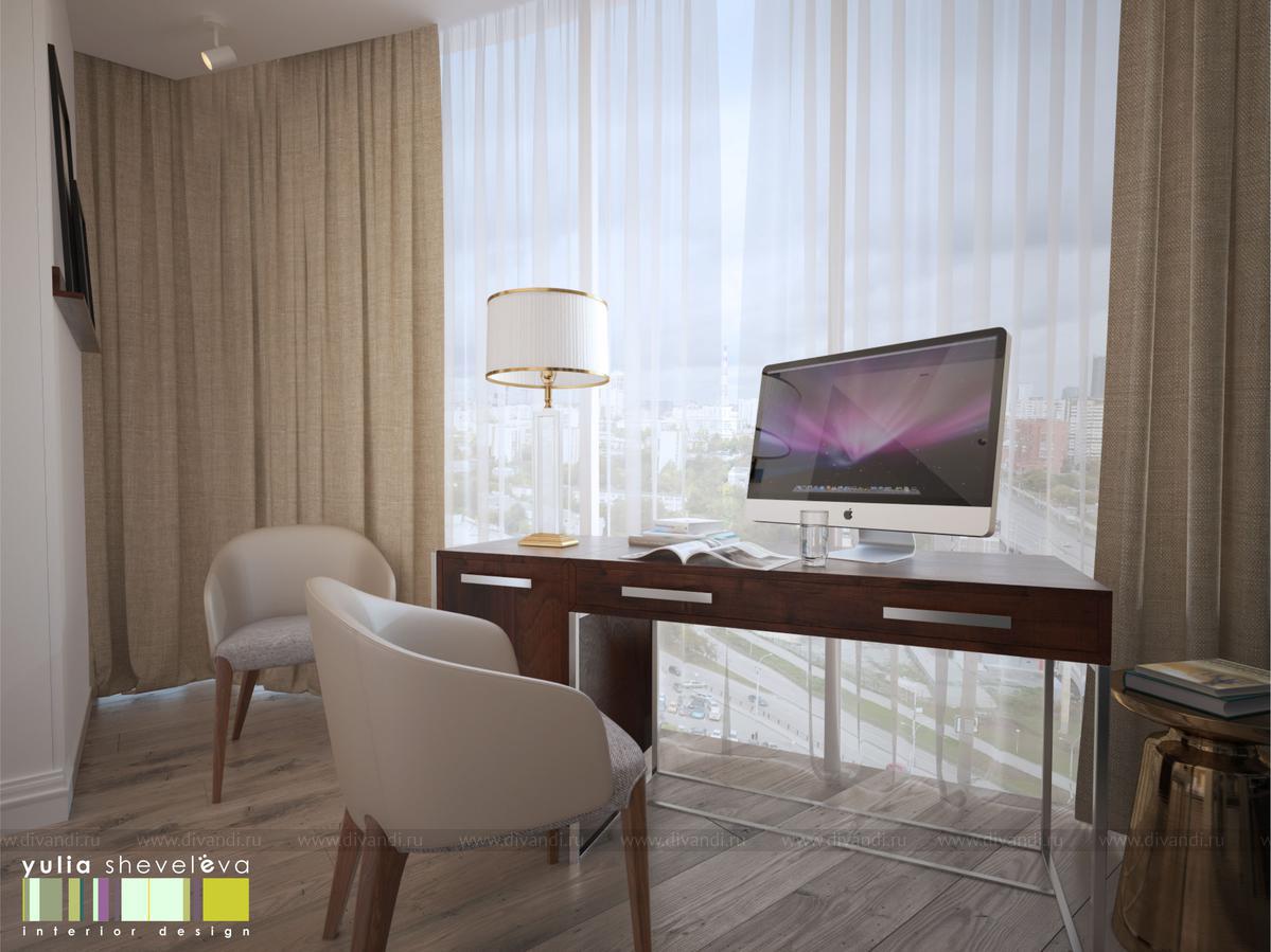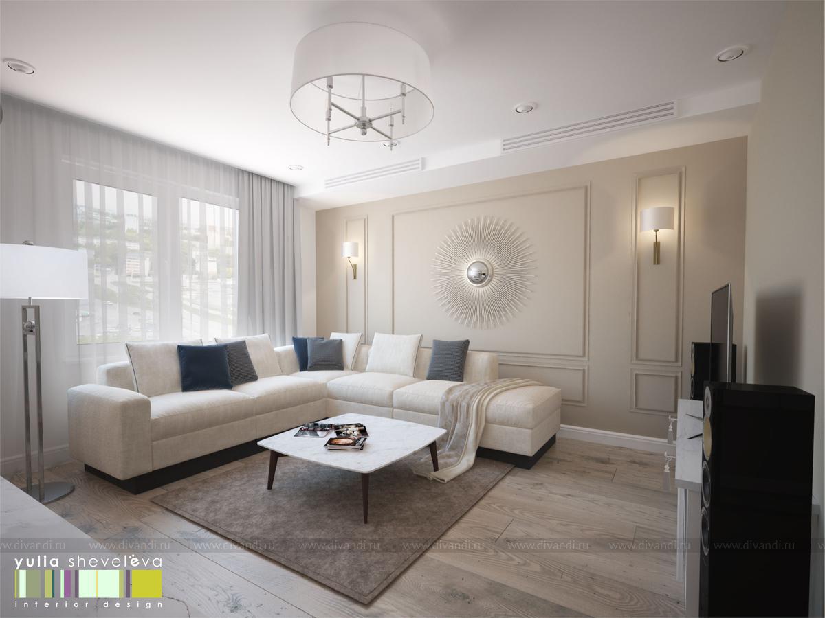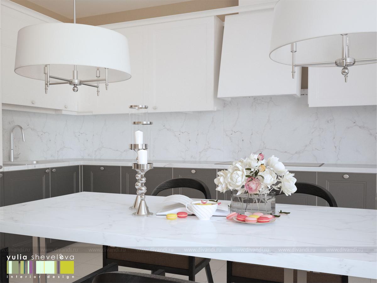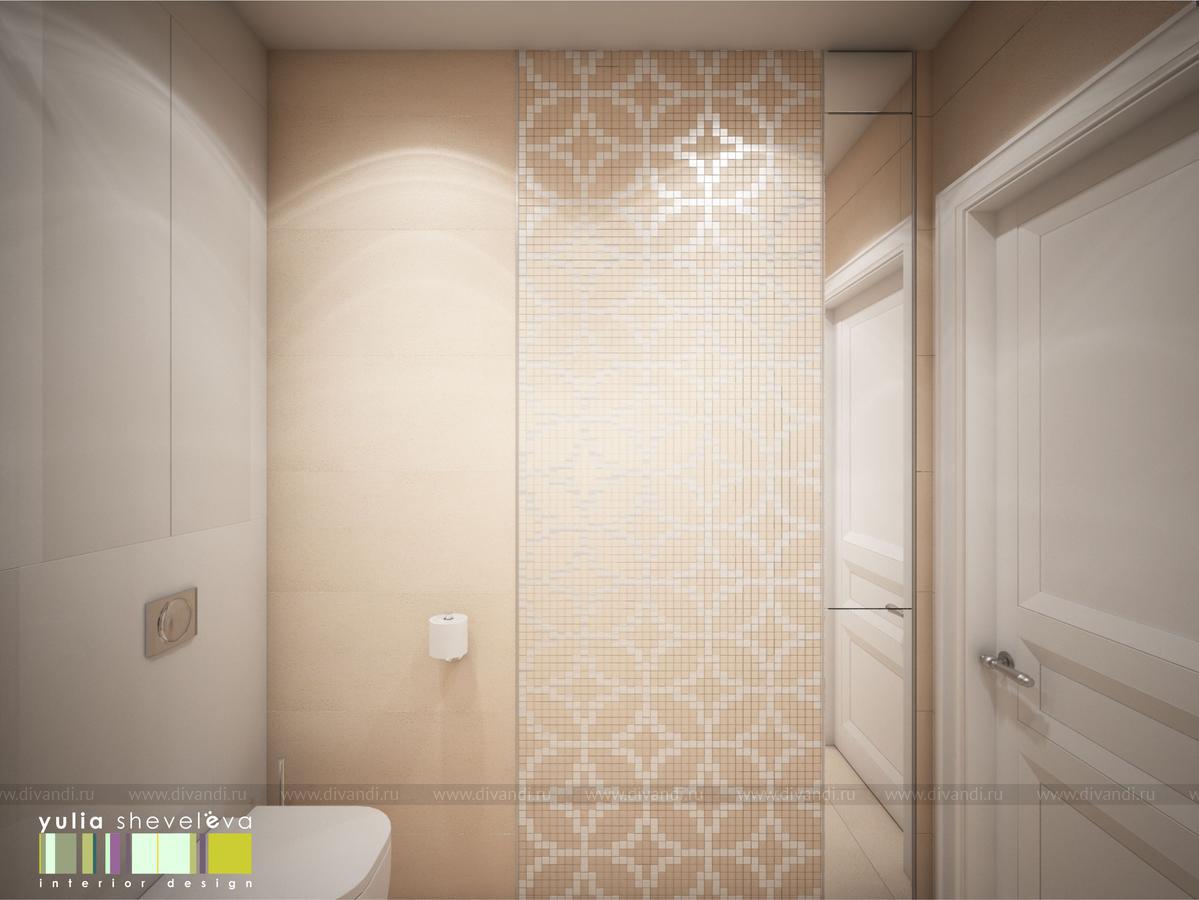Квартира г. Екатеринбург, общая площадь – 118 м кв. Год проектирования – 2017. Стиль для интерьера был выбран современный, с легкими миксами классического интерьера. Здесь и белоснежные фасады для кухни с филенками, лепной декор на стенах и красивый португальский ковер в холле. Материал для стен – водоэмульсионная краска сложного «грибного» оттенка. На полу в зоне кухни использована плитка, а в гостиной – дубовая паркетная доска. Двери выбрали белые классические с легкими филенками. Для детской остановились на выборе легкой и светлой цветовой гамме. За счет присоединенной лоджии (а их целых три в квартире!) удалось сделать дополнительное рабочее место. В спальне также сделали присоединение лоджии и тем самым выделив отдельный кабинет для главы семьи. Хозяйка квартиры очень любит цветы, поэтому цветочная тема легким лейтмотивом зашла в спальню. Панно с цветочной тематикой разместили за изголовьем кровати. Санузлы сделали в теплой песочной гамме, уютные и теплые, без вычурных декоров и рисунков. В качестве акцентов выступили панно из мозаики, а функциональное хранение бойлеров и фильтров было предусмотрено за зеркальными дверцами.