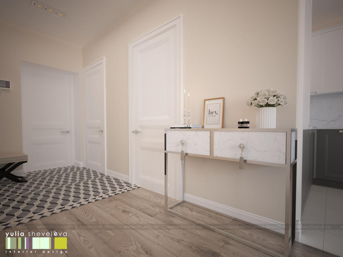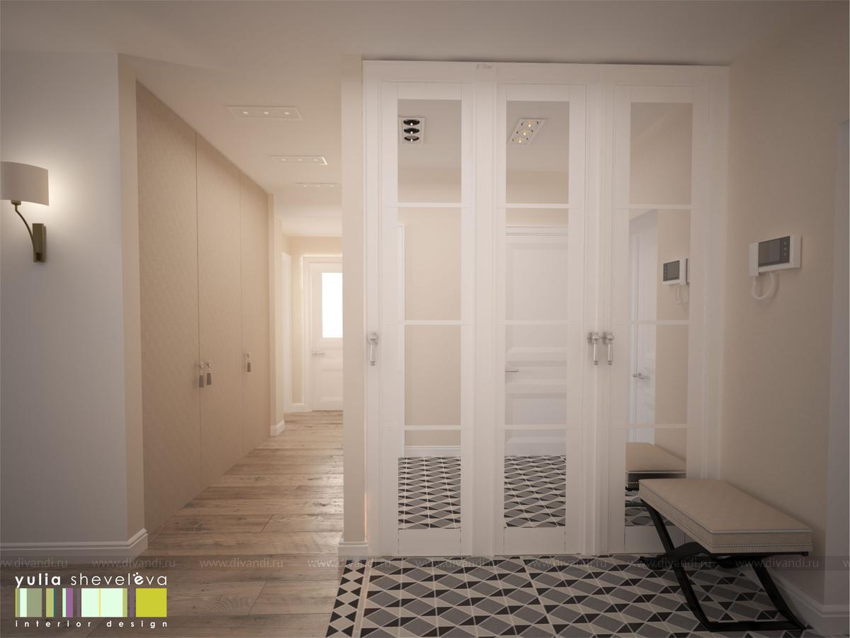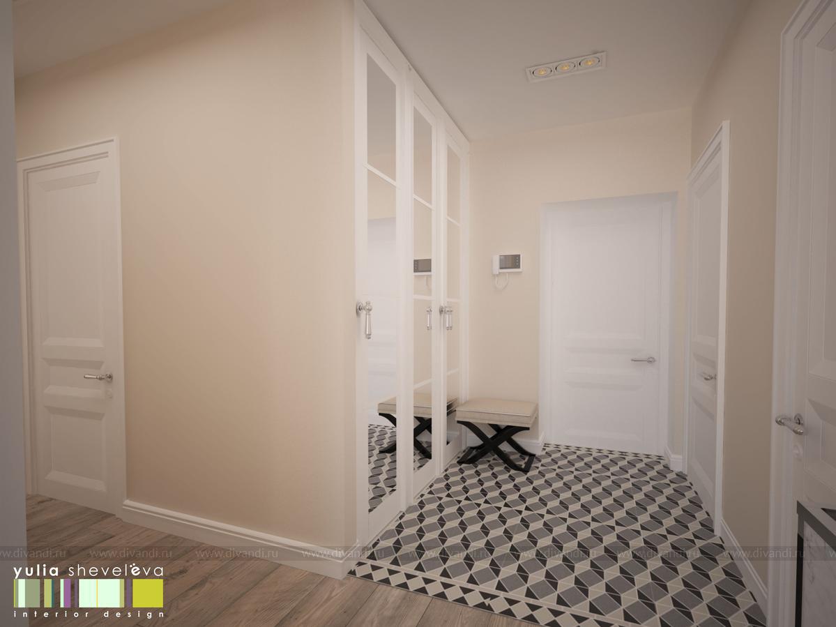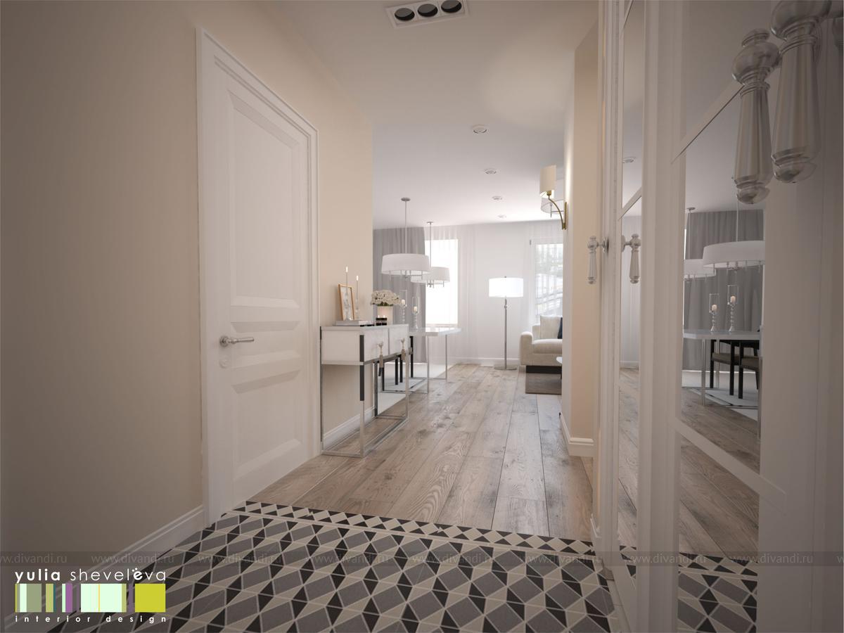 Квартира г. Екатеринбург, общая площадь – 118 м кв. Год проектирования – 2017. Стиль для интерьера был выбран современный, с легкими миксами классического интерьера. Здесь и белоснежные фасады для кухни с филенками, лепной декор на стенах и красивый португальский ковер в холле. Материал для стен – водоэмульсионная краска сложного «грибного» оттенка. На полу в зоне кухни использована плитка, а в гостиной – дубовая паркетная доска. Двери выбрали белые классические с легкими филенками. Для детской остановились на выборе легкой и светлой цветовой гамме. За счет присоединенной лоджии (а их целых три в квартире!) удалось сделать дополнительное рабочее место. В спальне также сделали присоединение лоджии и тем самым выделив отдельный кабинет для главы семьи. Хозяйка квартиры очень любит цветы, поэтому цветочная тема легким лейтмотивом зашла в спальню. Панно с цветочной тематикой разместили за изголовьем кровати. Санузлы сделали в теплой песочной гамме, уютные и теплые, без вычурных декоров и рисунков. В качестве акцентов выступили панно из мозаики, а функциональное хранение бойлеров и фильтров было предусмотрено за зеркальными дверцами.