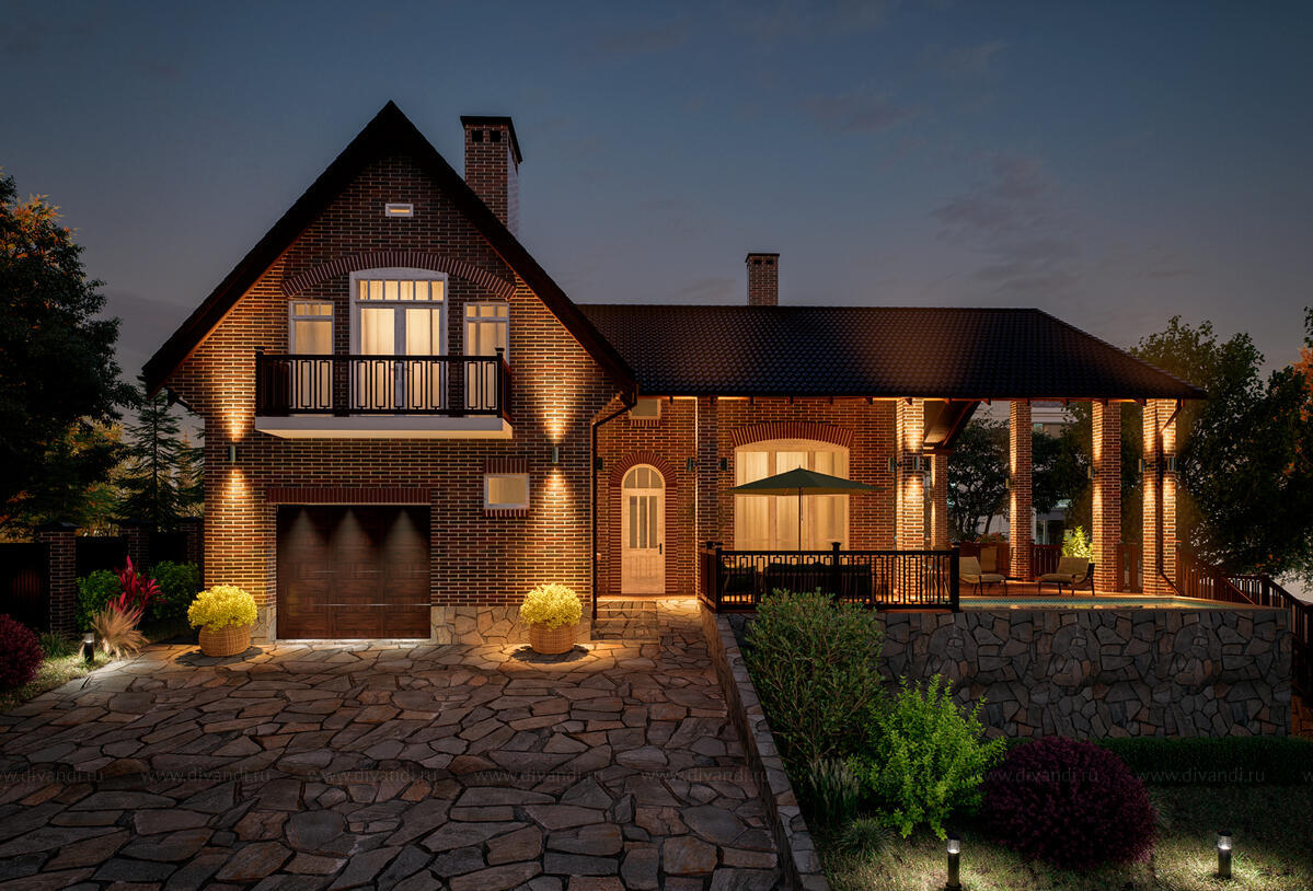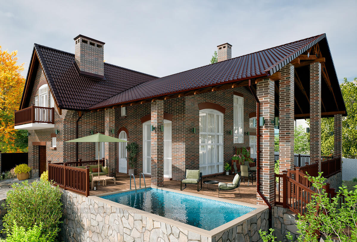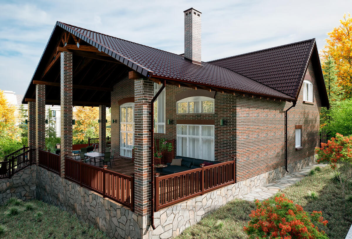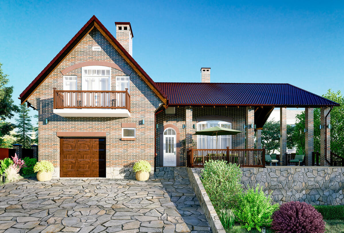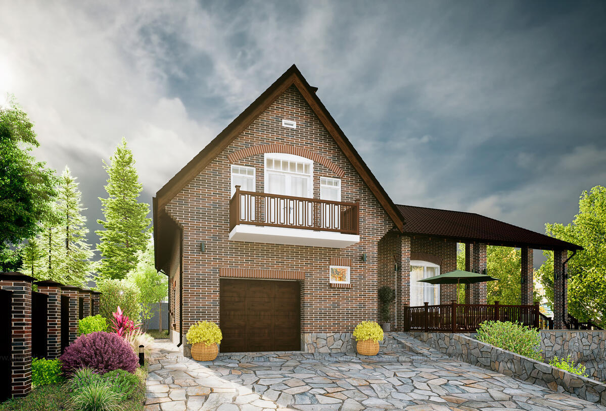 Проект 2-х этажного коттеджа в баварской кладке. Гармоничное сочетание материалов дома и ландшафта. Удобные планировки, оптимальные площади, универсальные пространства на двух этажах. Дом раскрыт на долину, имеет большую террасу, проектировался для побережья Чёрного моря.